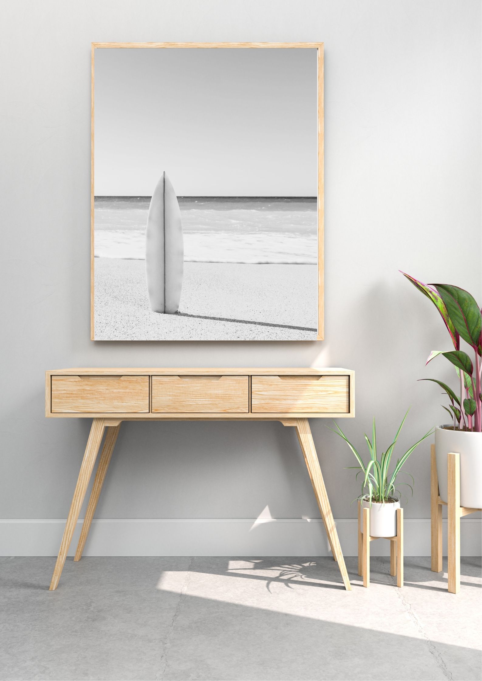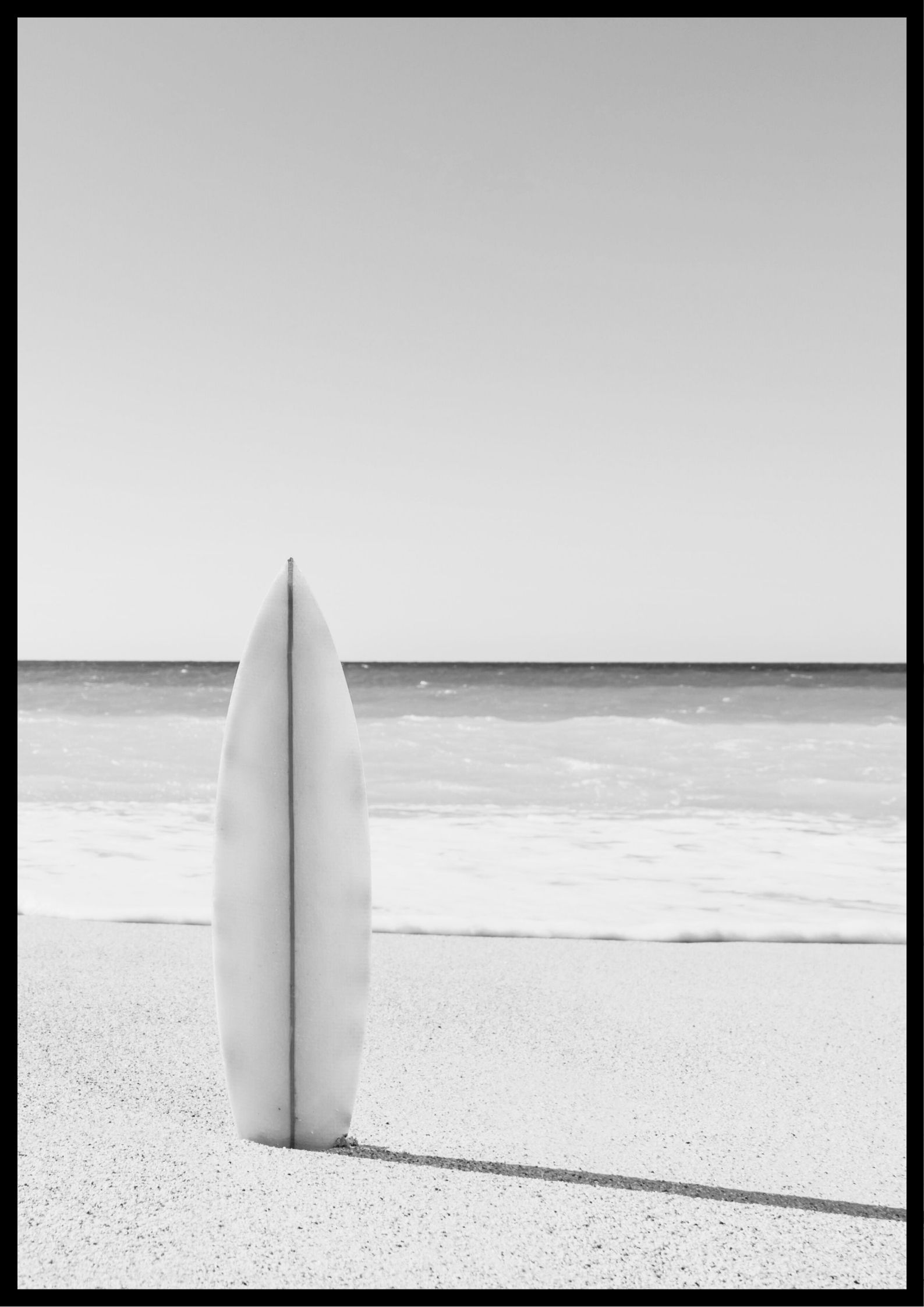 Cuadro sereno en blanco y negro de una tabla de surf en la arena de la playa. Da personalidad a cualquier habitación con este póster enmarcado. Impreso en papel grueso de alta calidad con acabado mate.